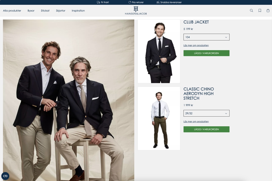 The shop the look functionality on Hansen & Jacob's webshop allows customers to shop for a complete outfit curated by the brand, streamlining the selection process. Customers can simply choose their sizes and add the entire outfit to their shopping cart with a single click.