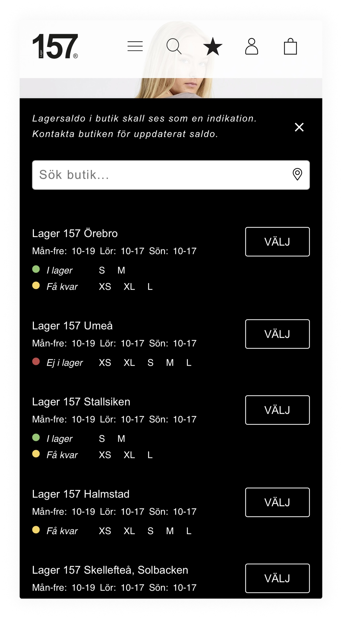 The omni channel concept requires the possibility to get information about the stock balance in each store. The functionality lets the customer easily select a store by searching for it or sharing their location.