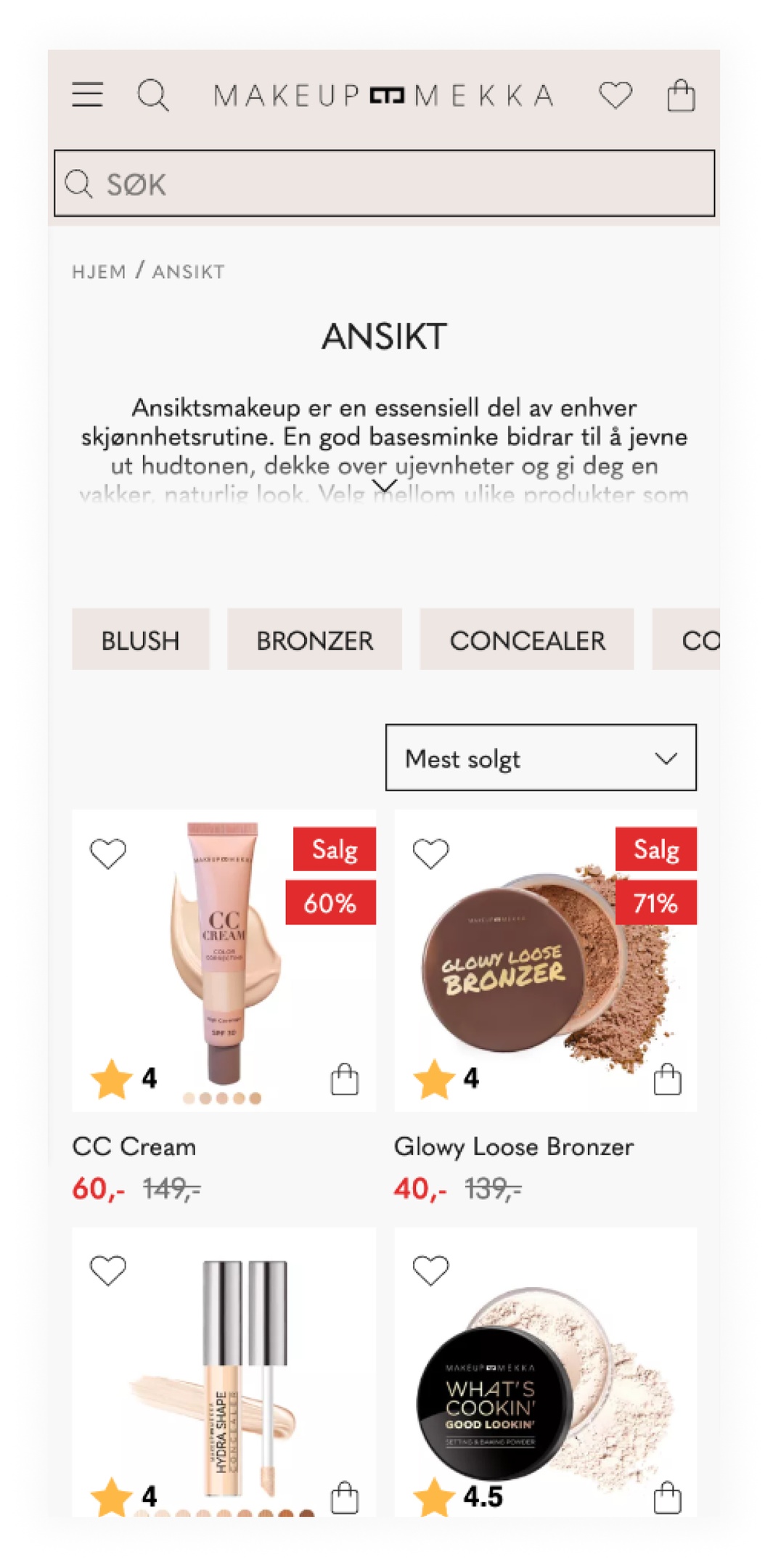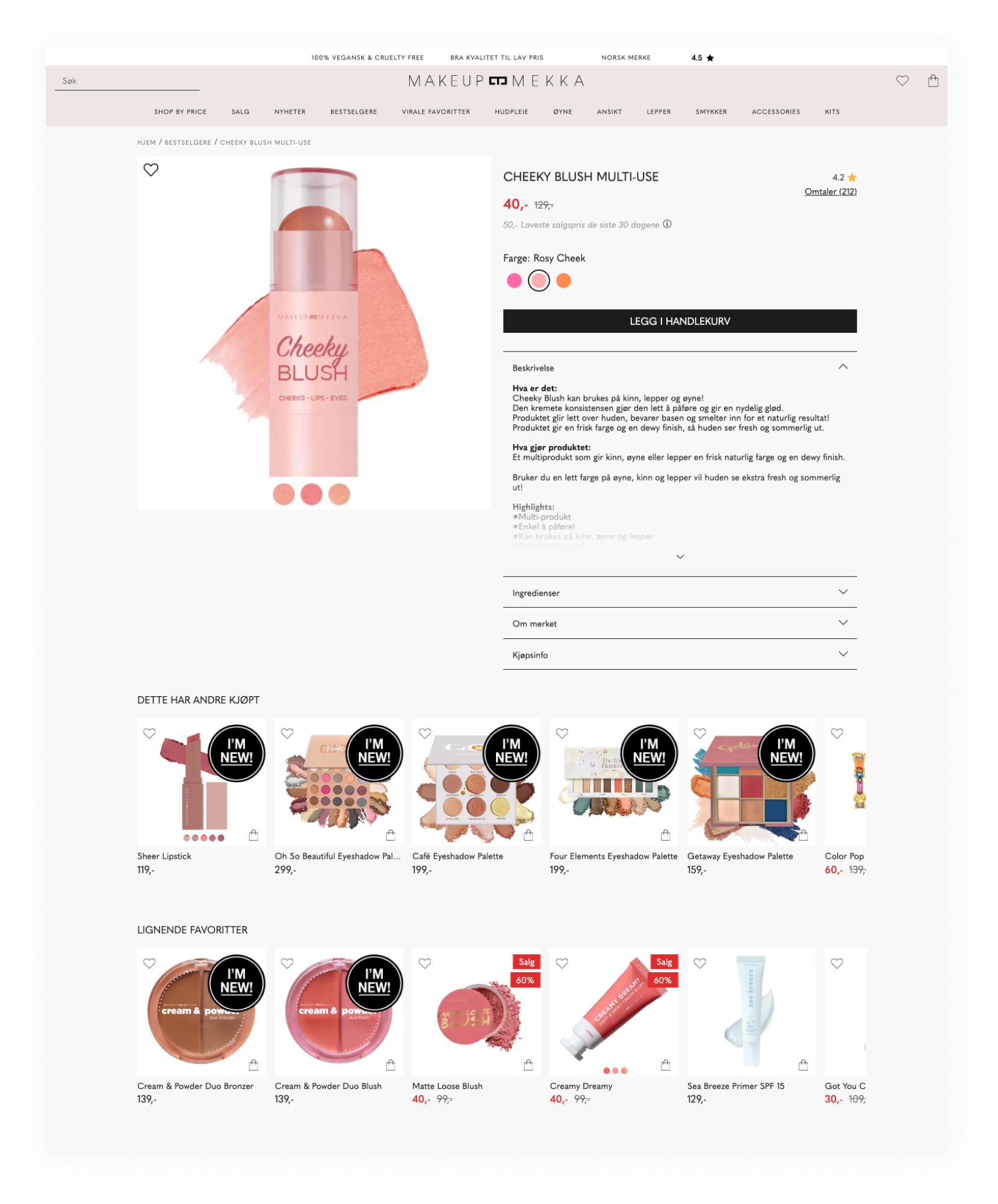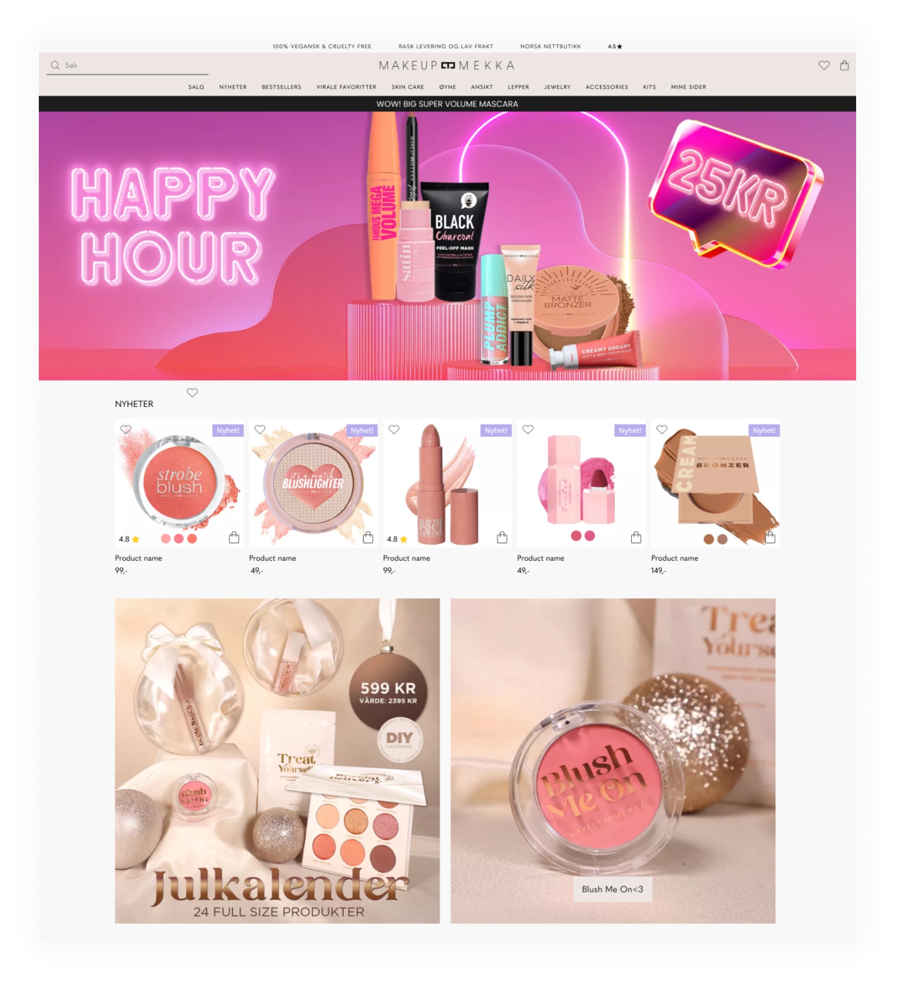 Makeup Mekka is a young, playful, and trendy beauty brand from Norway. Makeup Mekka attracts a young generation of primarily women in Scandinavia. The mission was to create a vibrant online shopping experience which resonates with the target audience. The new design is centered around capturing the essence of youthfulness, creativity, and self-expression through makeup.