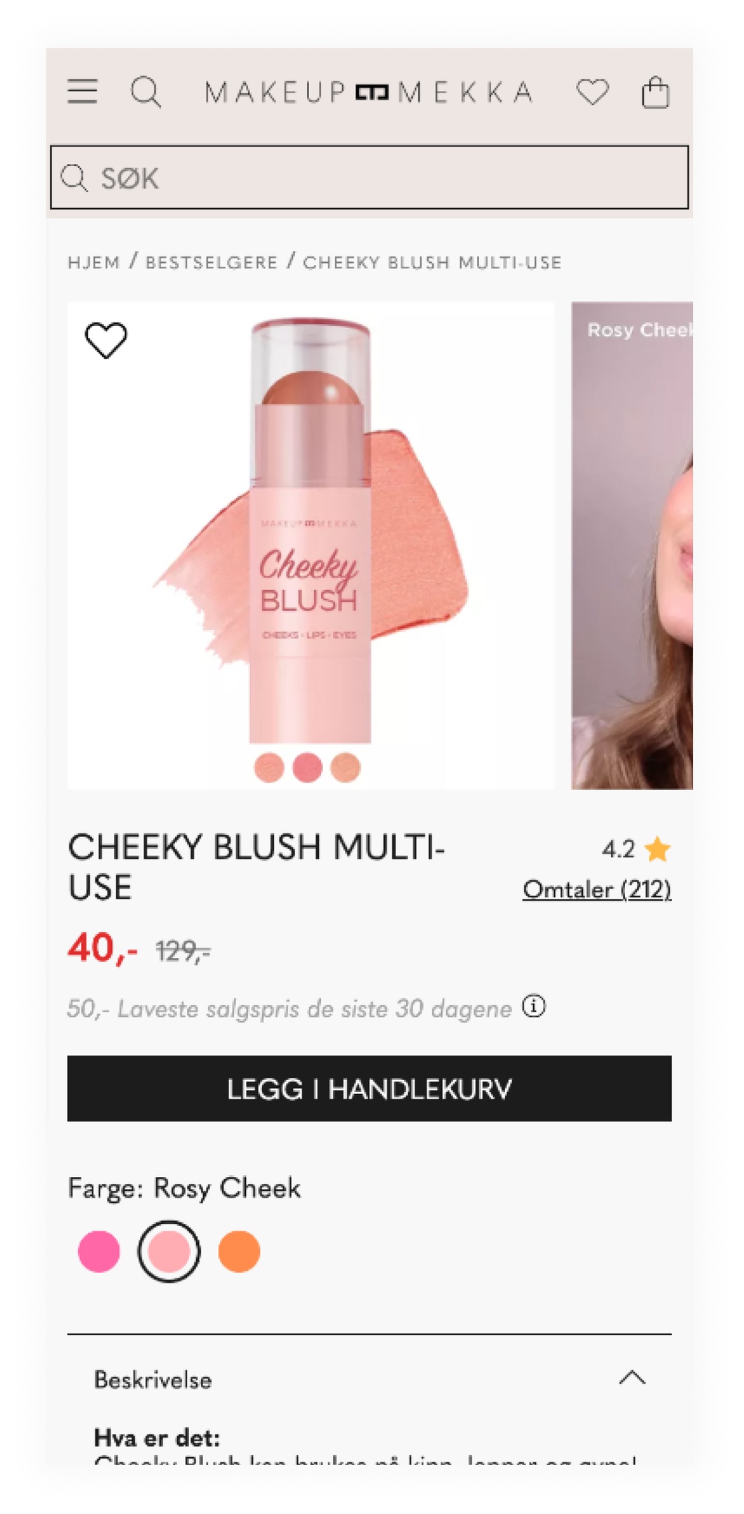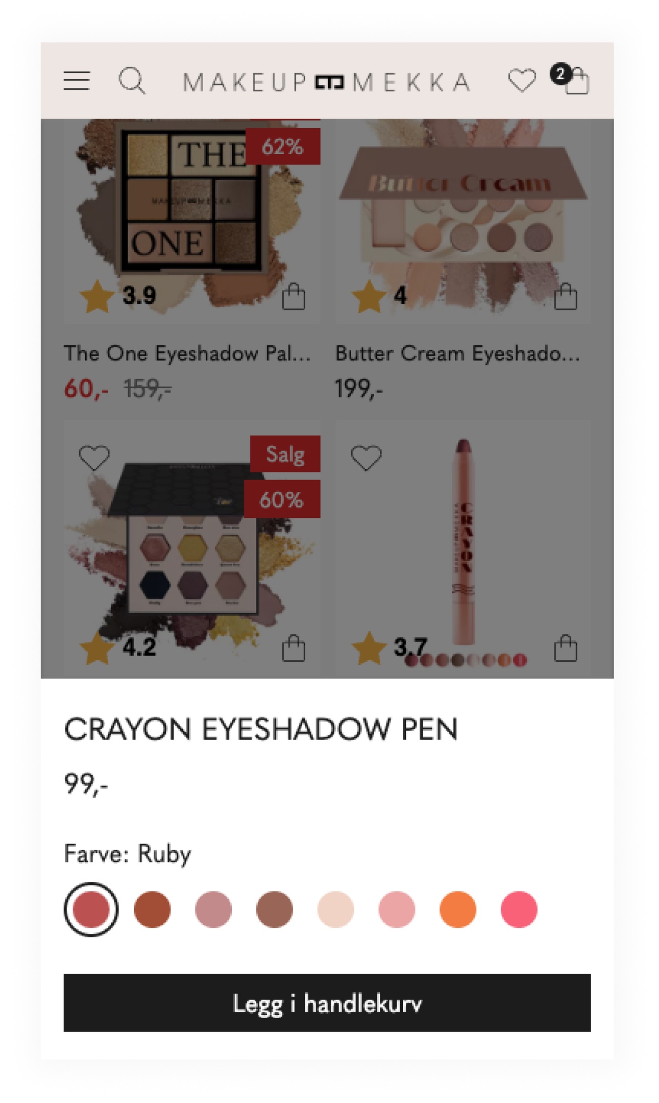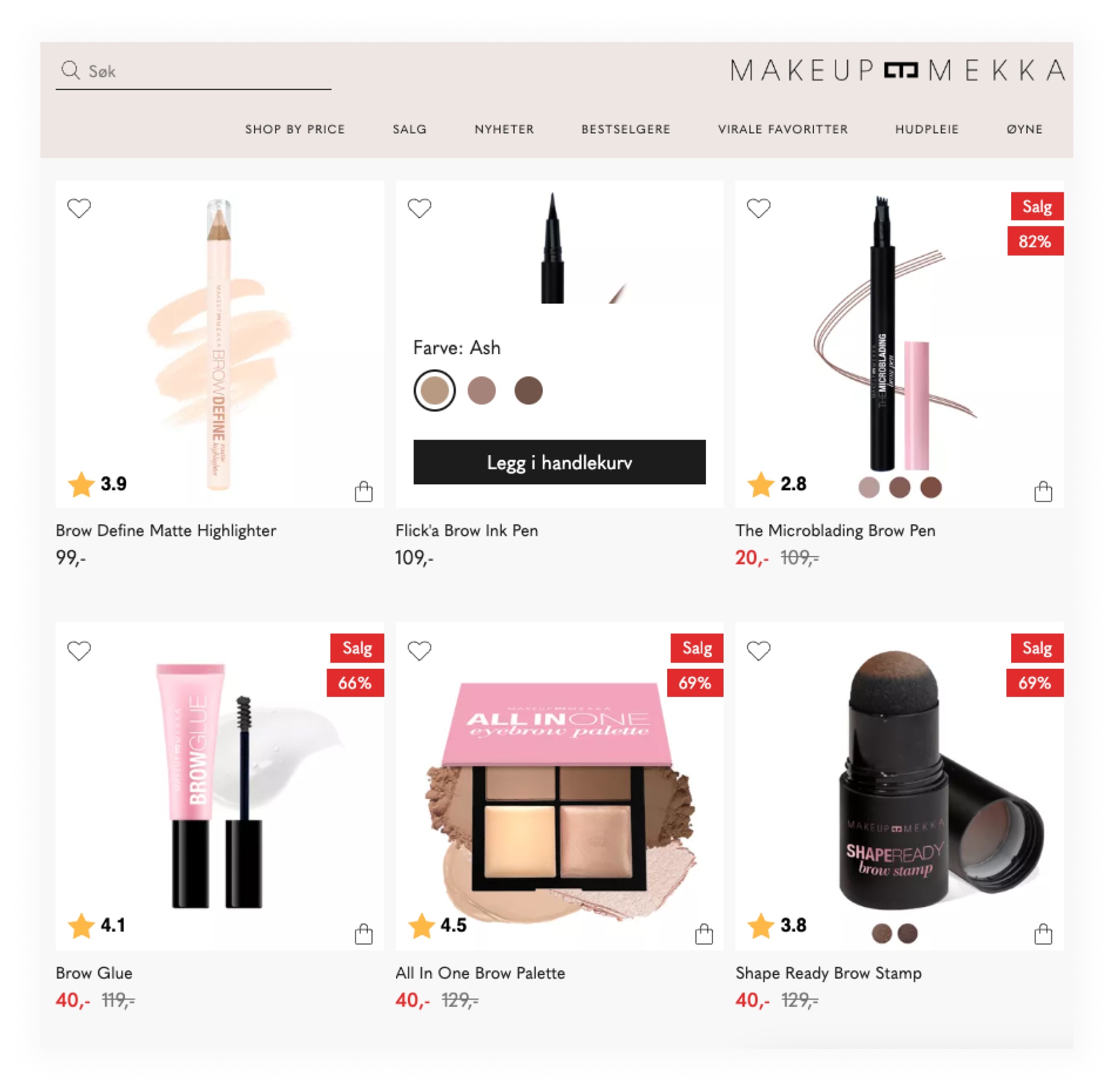 The typical customer buys multiple products every time they shop at Makeup Mekka. To make the shopping experience even better, we added a quickbuy functionality on the product listing page. By doing so we let the customer add more products to their cart with fewer clicks.