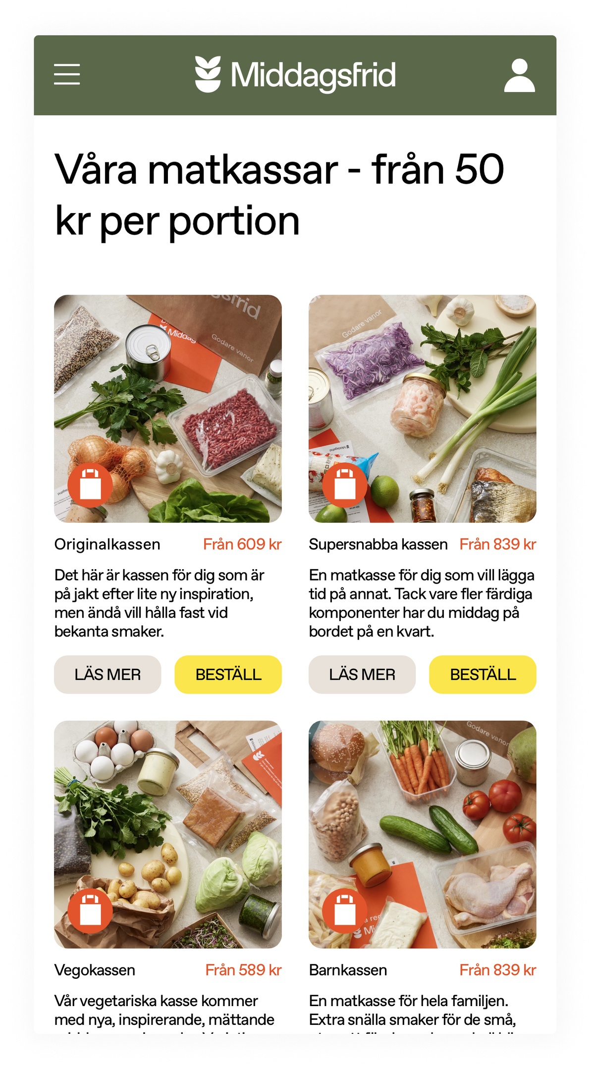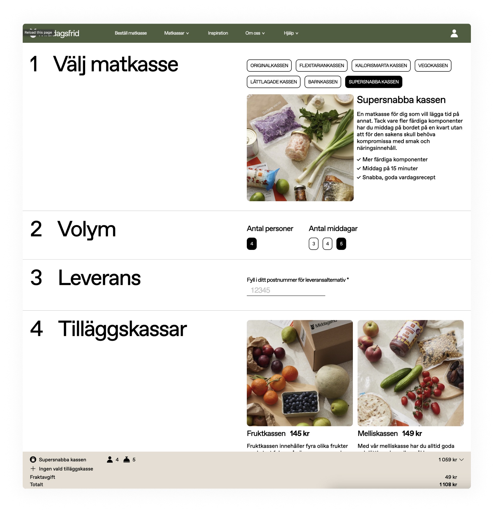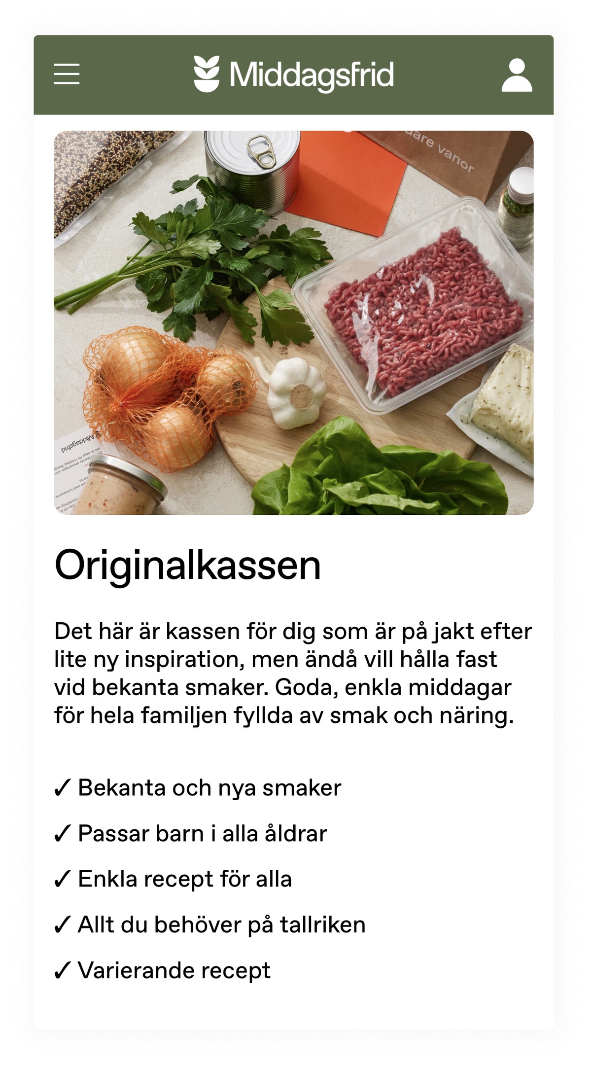 In 2022, Middagsfrid sought to rebuild their online presence to meet the demands of the market. Middagsfrid identified the need for a new graphical profile as well as a new site offering new functionality that would bring in new customers. In our project with Middagsfrid we managed to design a completely new website with focus on the user experience in record time. Going into the project, Middagsfrid also migrated to Viskan Subscription for their daily operations. Thanks to a close and fruitful collaboration with the Middagsfrid team we managed to reach a record short time-to-market.