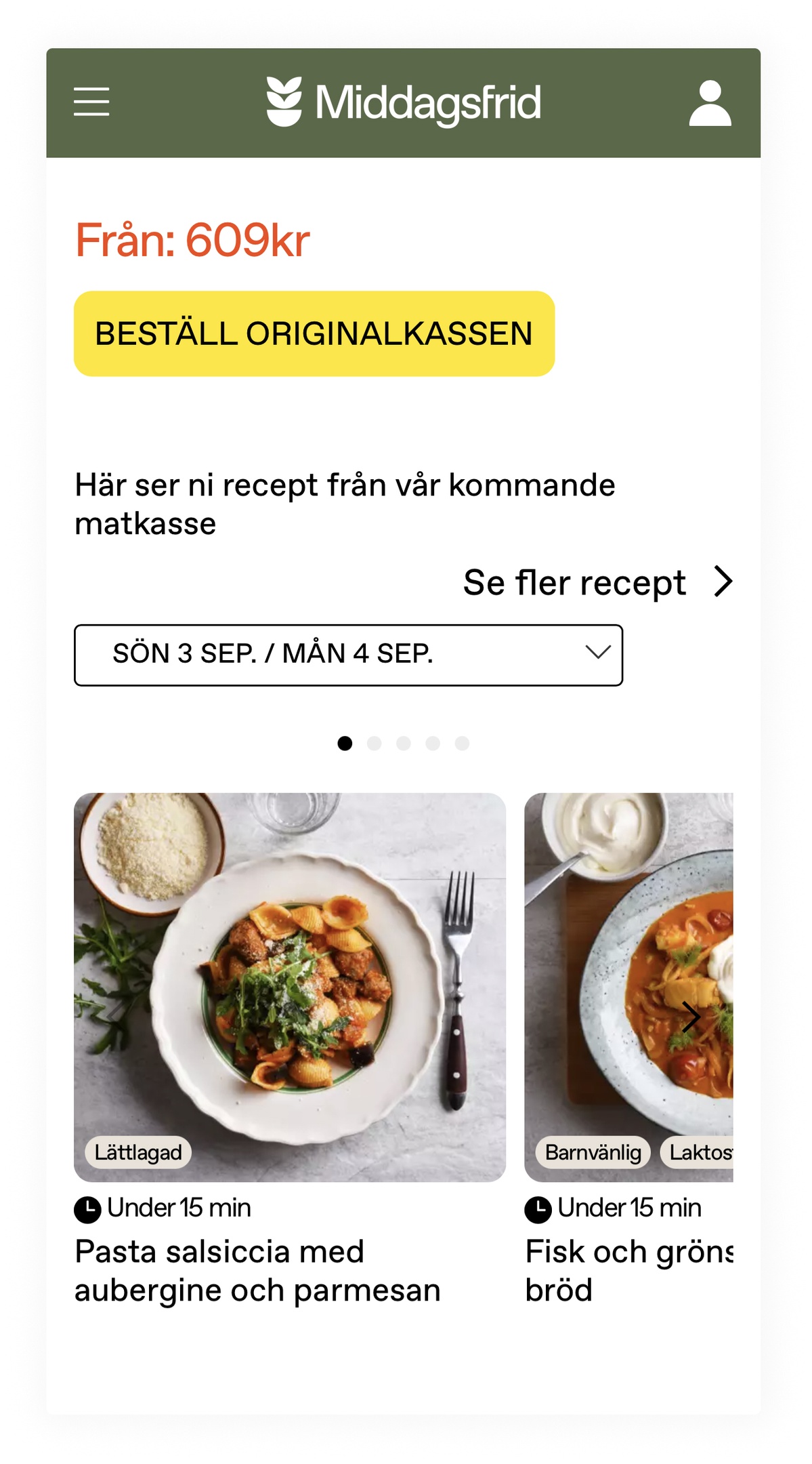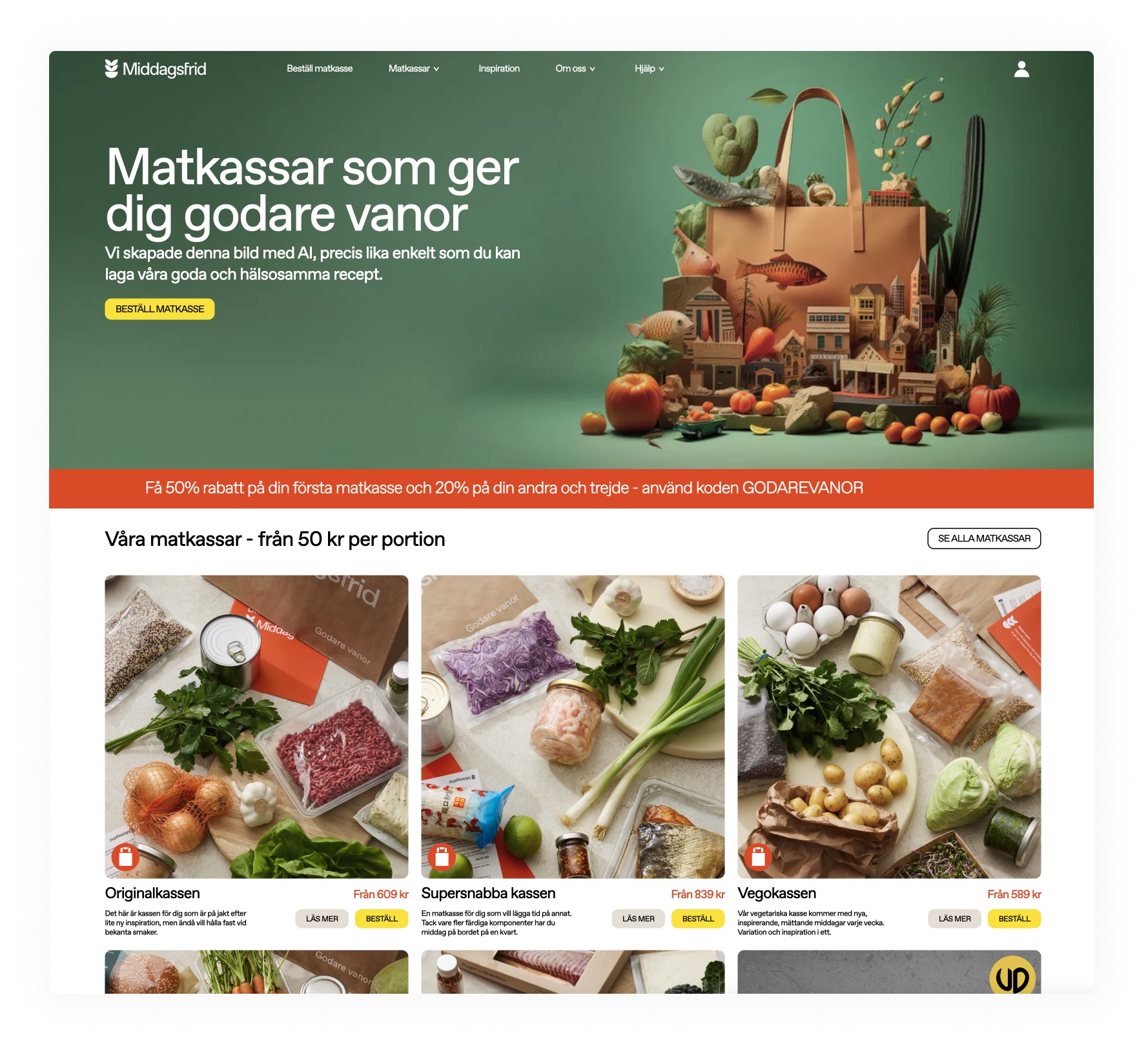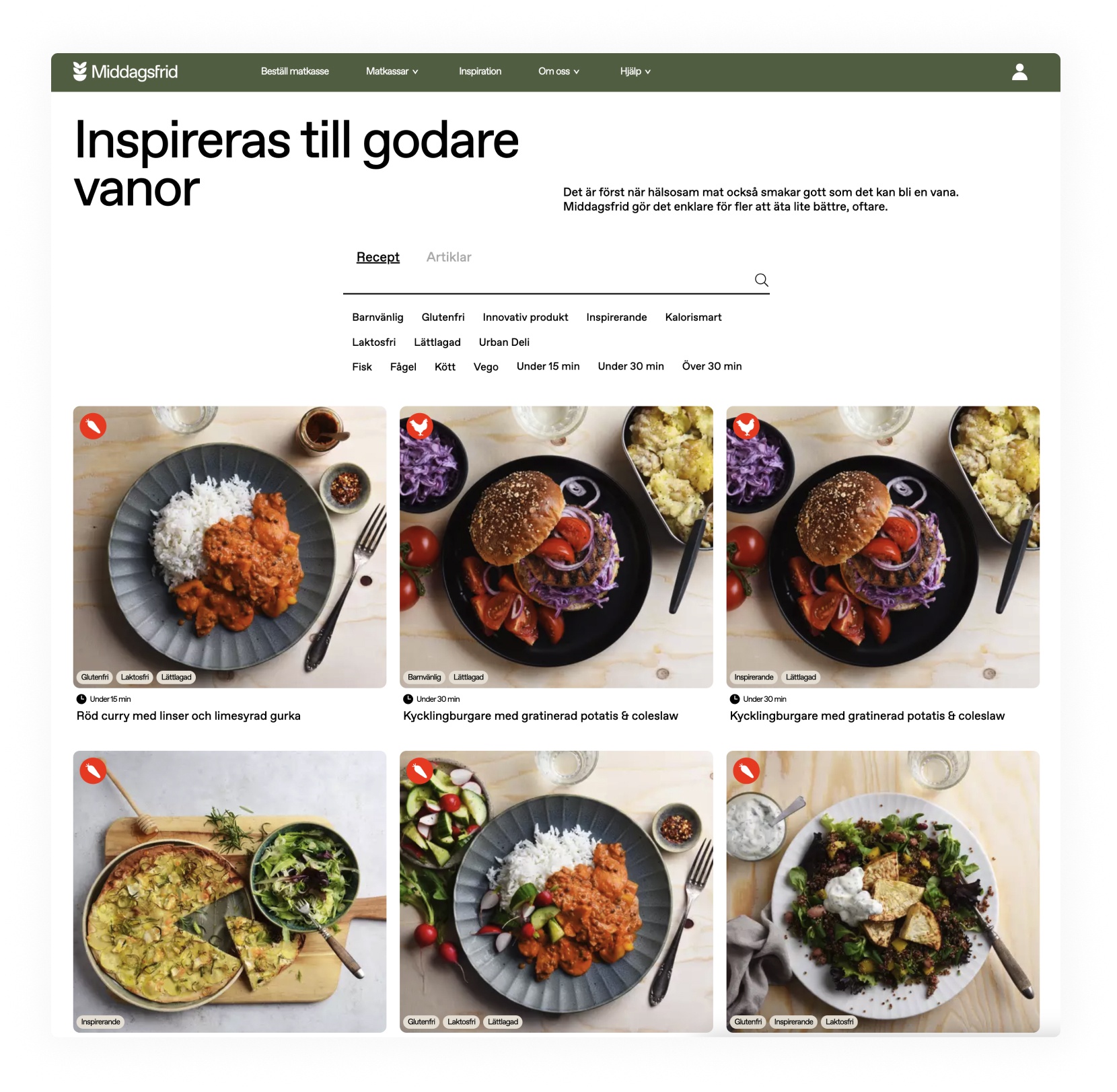 In 2022, Middagsfrid sought to rebuild their online presence to meet the demands of the market. Middagsfrid identified the need for a new graphical profile as well as a new site offering new functionality that would bring in new customers. In our project with Middagsfrid we managed to design a completely new website with focus on the user experience in record time. Going into the project, Middagsfrid also migrated to Viskan Subscription for their daily operations. Thanks to a close and fruitful collaboration with the Middagsfrid team we managed to reach a record short time-to-market.